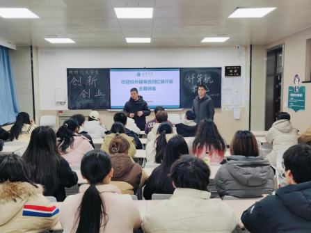 辅导员武旭老师首先进班为同学们介绍了校外辅导员闫红旗老师,欢迎校外辅导员闫红旗开展主题讲座,对本次创新创业讲座的关注。
