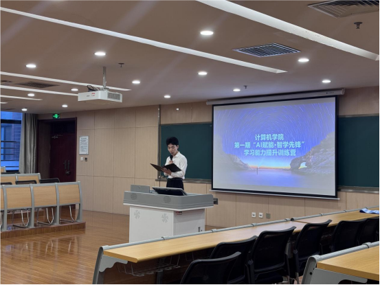 4月16日晚,计算机学院“AI赋能·智学先锋”第一期学生学习能力提升训练营开班仪式在图书馆304学术报告厅举行。学院党委书记童绥勇、计算机系主任刘婧、学生工作办公室主任李守晶、训练营指导教师周柏岐、张鑫及全体学员参加仪式。仪式由我院学生杨骞主持。