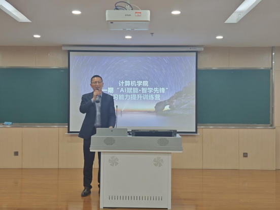 计算机系主任刘婧作动员讲话。她结合计算机学科前沿发展趋势,阐述了在人工智能时代背景下,掌握并运用AI工具对学生专业学习与未来发展的重要意义。她指出,本次训练营通过系统化、实战化课程,帮助学生从“工具使用者”成长为“问题解决者”与“创新驱动者”,并对学员提出扎实学习、勇于实践的要求。